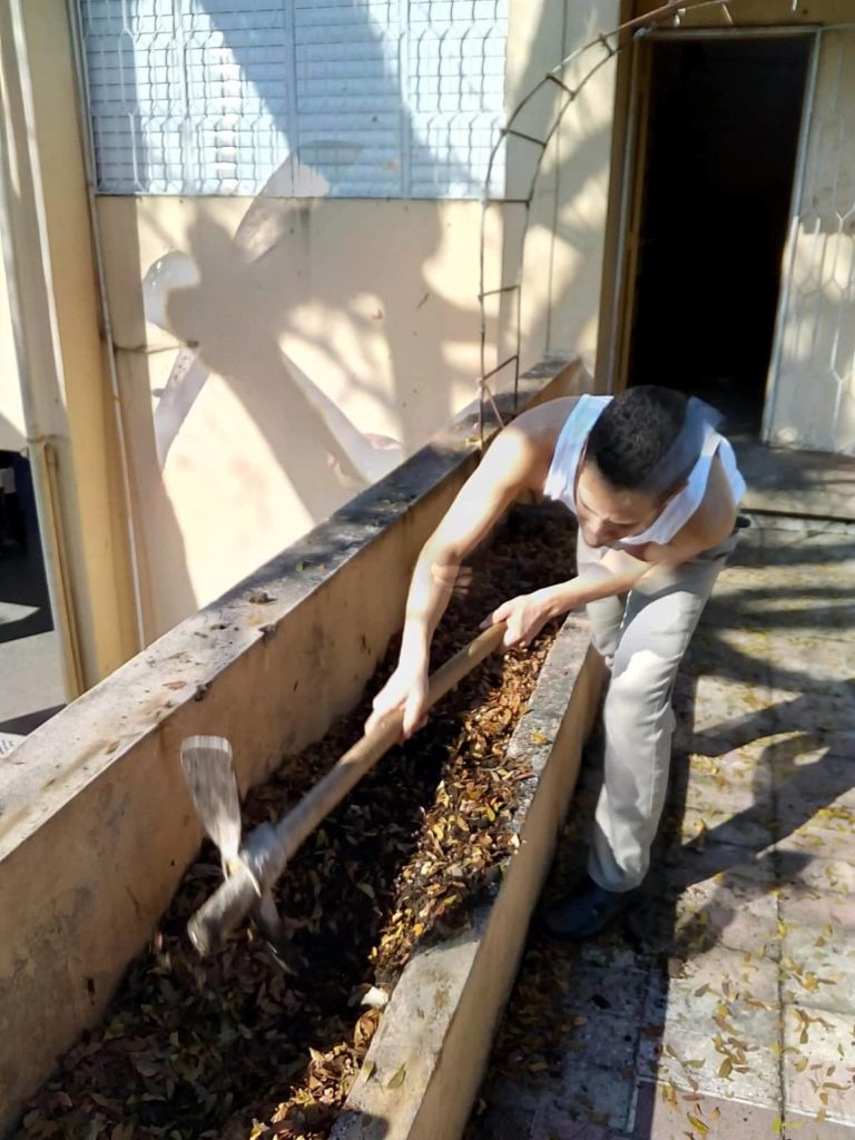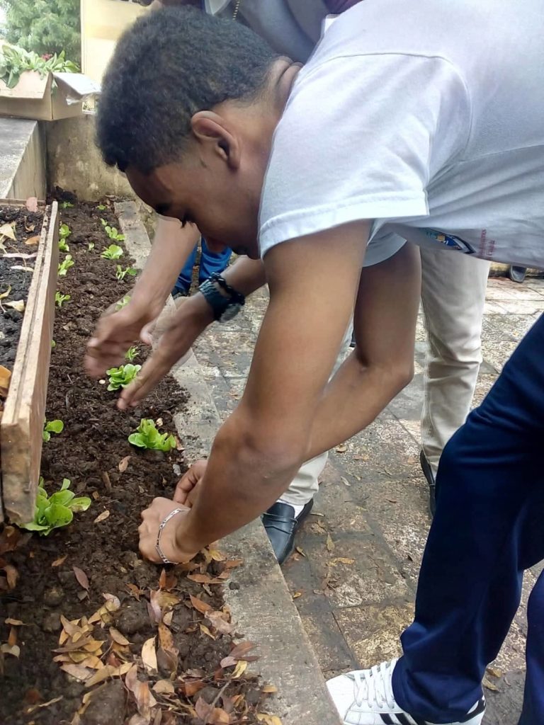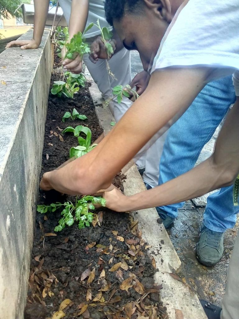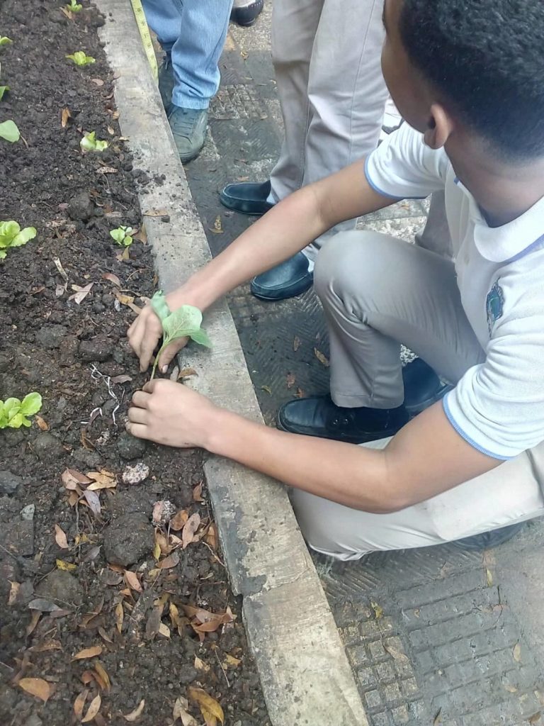 En Octubre del 2018, un equipo de estudiantes seleccionado por los maestros encargados del proyecto “Huerto Escolar”: Limpiaron, araron, pintaron, organizaron y sembraron; convirtiendo la galería del espacio de clausura en un Huerto Escolar, donde los estudiantes de 1ro y 4to Grado de Secundaria, durante el Año Escolar 2018-2019 cultivaron: ajíes, berenjenas, verduras, lechuga, espinacas, entre otros.